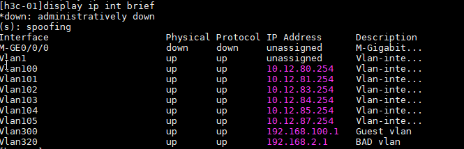 interface Vlan-interface300 description Guest vlan ip address 192.168.100.1 255.255.252.0 packet-filter 3000 inbound packet-filter 3000 outbound