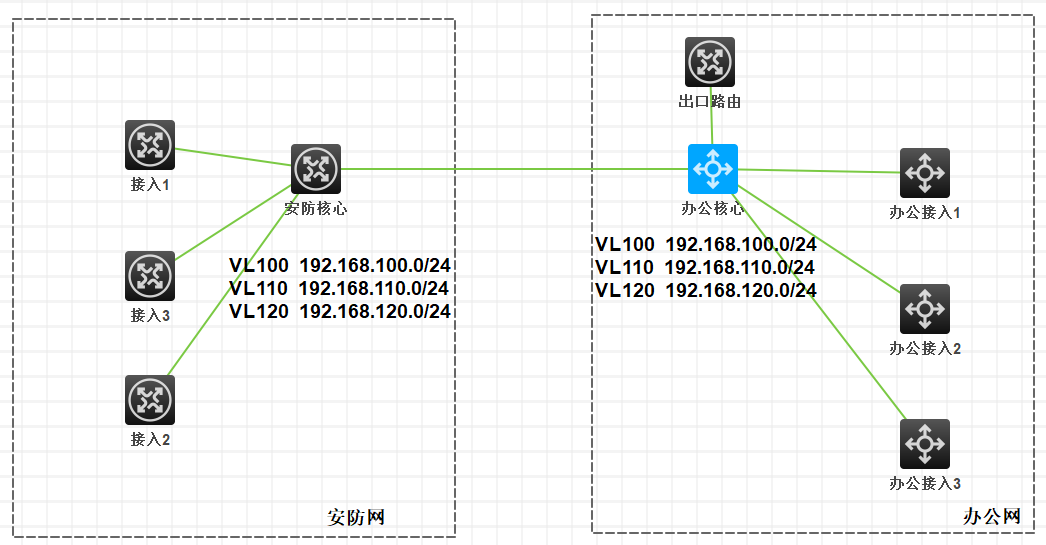 初期建设的时候因没有安防和办公的互联需求,所以两边划的相同的VLAN和IP地址段