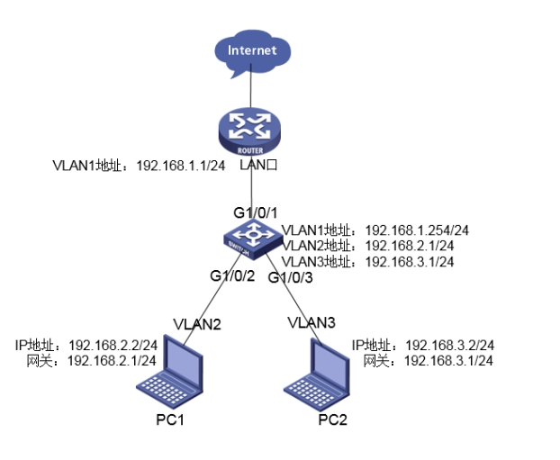 交换机作为下面两个网段,192.168.2.0/24网段和192.168.3.0/24网段的网关。在交换机上创建两个vlan虚地址,并添加缺省路由指向路由器的网关,路由器上添加两条明细的回程路由,交换机的G1/0/2接PC1,G1/0/3接PC2,要求PC1和PC2可以访问互联网(访问路由器的网关)。