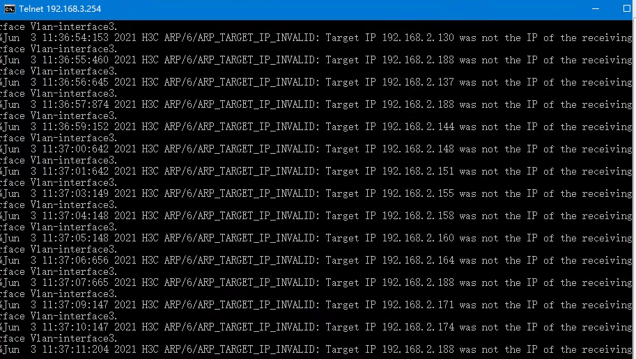 举例 | ARP/6/ARP_TARGET_IP_INVALID: Target IP 192.168.10.2 was not the IP of the receiving interface Ethernet0/1/0. |