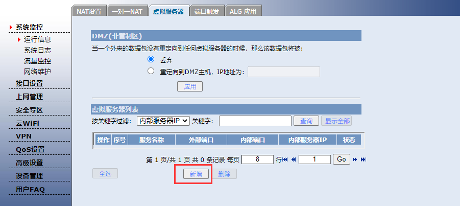 问题:按照高级设置-地址转换-虚拟服务器-新增来设置,问题在于在点“新增”的时候,没有反应。请问是什么原因,要怎么处理呢?