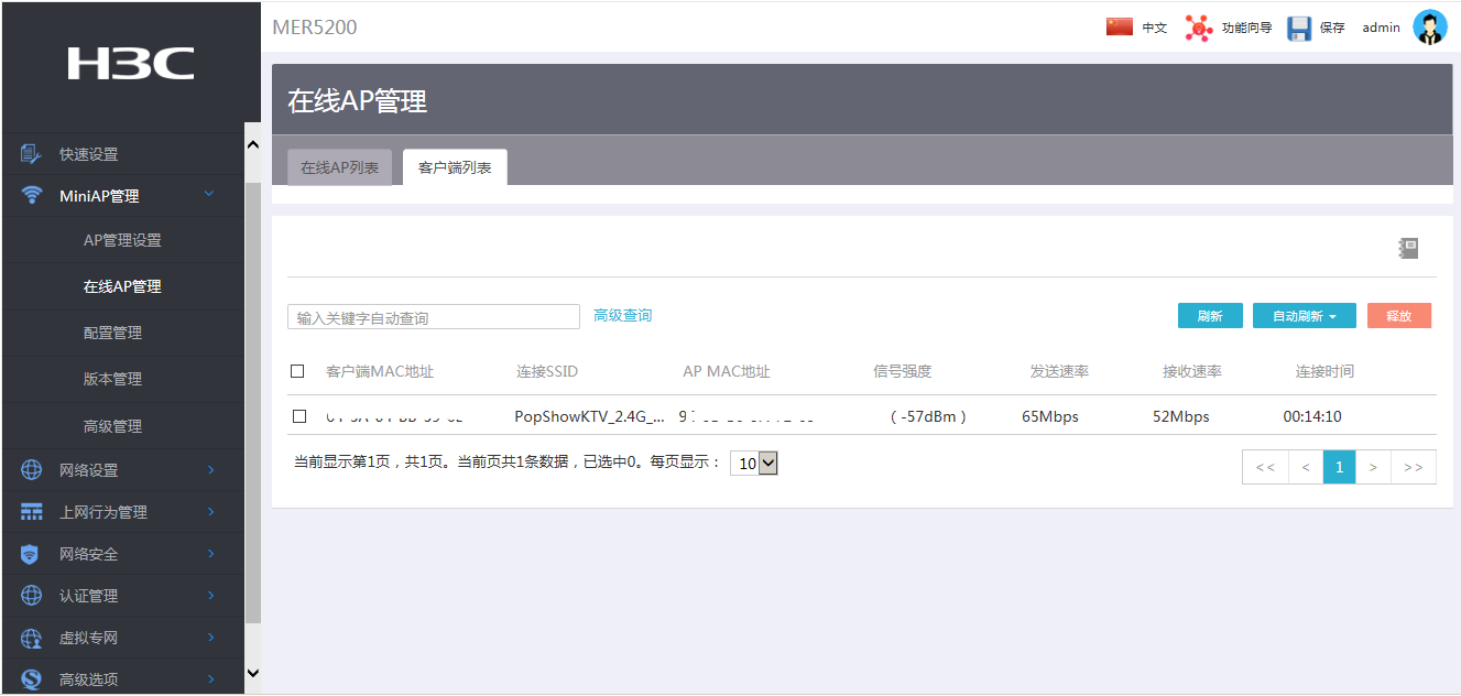 如图,为何在客户端里始终只能看到1台设备,现在大部分都下线了,高峰期很多设备连接上,但还是只显示1台客户端在线。