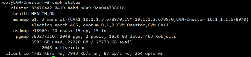 这种情况还是联系400排查下是什么原因吧,cvk1肯定是有一块盘有问题了,得确认是不是硬件问题、要不要换盘。看描述一共5台主机,那CVM-ONESTOR这台主机是不是有问题?单独看一下主机状态呢,这台主机上的所有osd都down了,先看看硬件本身是不是出了问题