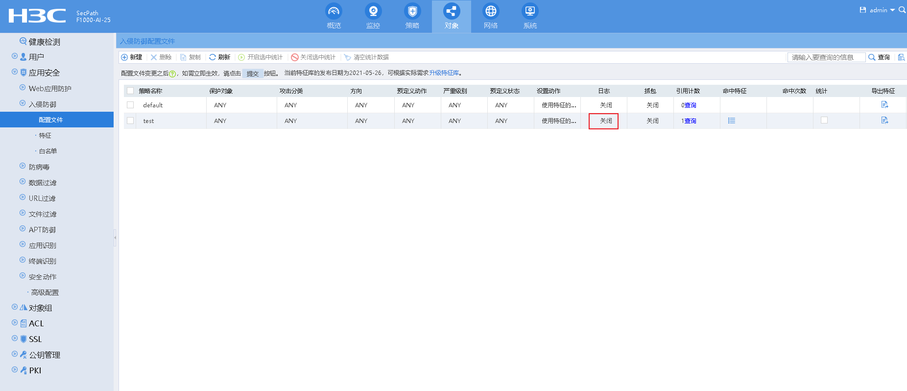 防火墙 怎么配置入侵防御的日志记录。这个配置文件的日志一直都是关闭,也是一直没记日志
