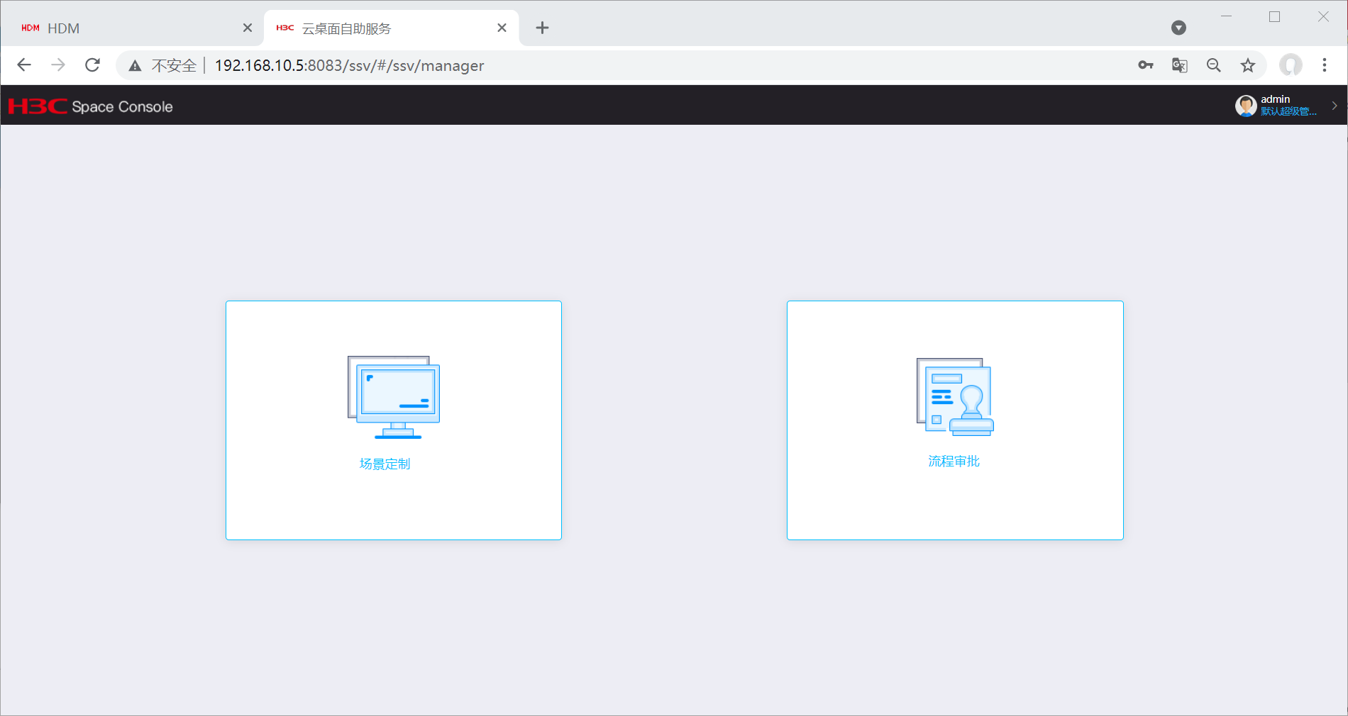 按照H3C Workspace云桌面 安装指导-E1009-5W114-整本手册.pdf安装配置Workspace E1009版本,只有一台服务器,双CPU,256G内存,没有,有8个1.2TB 10K硬盘,前两个设置为raid1用来安装系统,后6个设置为raid5,安装完系统配置完IP 192.168.10.5后,登录http://192.168.10.5:8083/ssv后没有初始化界面,只有 场景定制 和 流程审批 两个可点击选项。也看不到左边的 桌面池、桌面镜像等菜单,麻烦大师们帮助看下如何才能进入初始化界面,谢谢!