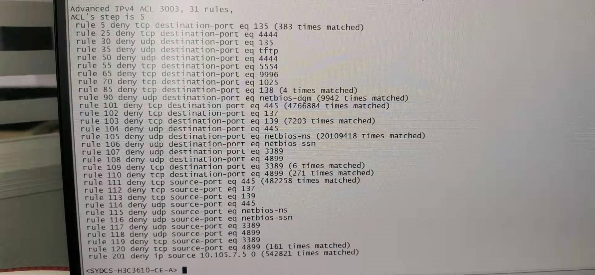 配置了acl策略,放通访问10.0.0.1,然后拒绝访问其他终端设备的445端口,通过display acl 可以看到deny 445 端口的规则已经macth了,但仍然有其他设备可以通过广域网端口访问 10.0.0.20 的445端口。