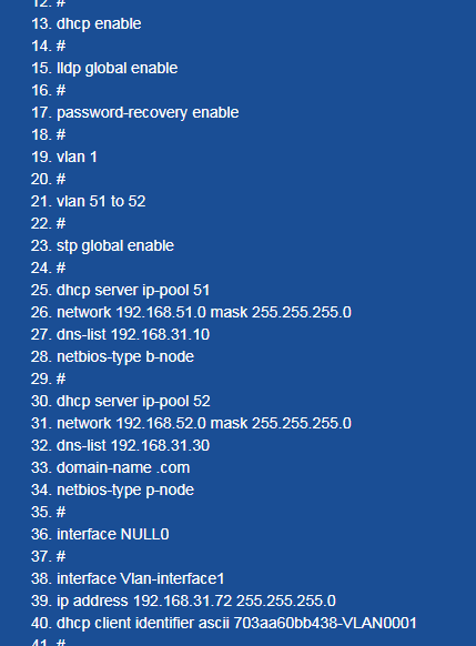 # version 7.1.070, Release 6312P01 # sysname H3C # telnet server enable # irf mac-address persistent timer irf auto-update enable undo irf link-delay irf member 1 priority 1 # dhcp enable # lldp global enable # password-recovery enable # vlan 1 # vlan 51 to 52 # stp global enable # dhcp server ip-pool 51 network 192.168.51.0 mask 255.255.255.0 dns-list 192.168.31.10 netbios-type b-node # dhcp server ip-pool 52 network 192.168.52.0 mask 255.255.255.0 dns-list 192.168.31.30 domain-name .com netbios-type p-node # interface NULL0 # interface Vlan-interface1 ip address 192.168.31.72 255.255.255.0 dhcp client identifier ascii 703aa60bb438-VLAN0001 # interface Vlan-interface51 ip address 192.168.51.1 255.255.255.0 # interface Vlan-interface52 ip address 192.168.52.1 255.255.255.0 # interface GigabitEthernet1/0/1 port link-mode route ip address 192.168.32.254 255.255.255.252 # interface GigabitEthernet1/0/2 port link-mode route # interface GigabitEthernet1/0/3 port link-mode bridge port access vlan 51 # interface GigabitEthernet1/0/4 port link-mode bridge port link-type hybrid port hybrid vlan 51 tagged port hybrid vlan 1 untagged # interface GigabitEthernet1/0/5 port link-mode bridge port access vlan 51 # interface GigabitEthernet1/0/6 port link-mode bridge # interface GigabitEthernet1/0/7 port link-mode bridge # interface GigabitEthernet1/0/8 port link-mode bridge # interface GigabitEthernet1/0/9 port link-mode bridge # interface GigabitEthernet1/0/10 port link-mode bridge port access vlan 52 # interface GigabitEthernet1/0/11 port link-mode bridge port link-type hybrid port hybrid vlan 52 tagged port hybrid vlan 1 untagged # interface GigabitEthernet1/0/12 port link-mode bridge # interface GigabitEthernet1/0/13 port link-mode bridge # interface GigabitEthernet1/0/14 port link-mode bridge # interface GigabitEthernet1/0/15 port link-mode bridge # interface GigabitEthernet1/0/16 port link-mode bridge # interface GigabitEthernet1/0/17 port link-mode bridge combo enable auto # interface GigabitEthernet1/0/18 port link-mode bridge combo enable auto # interface GigabitEthernet1/0/19 port link-mode bridge combo enable auto # interface GigabitEthernet1/0/20 port link-mode bridge combo enable auto # interface GigabitEthernet1/0/21 port link-mode bridge combo enable auto # interface GigabitEthernet1/0/22 port link-mode bridge combo enable auto # interface GigabitEthernet1/0/23 port link-mode bridge combo enable auto # interface GigabitEthernet1/0/24 port link-mode bridge combo enable auto # interface M-GigabitEthernet0/0/0 # interface Ten-GigabitEthernet1/0/25 port link-mode bridge # interface Ten-GigabitEthernet1/0/26 port link-mode bridge # interface Ten-GigabitEthernet1/0/27 port link-mode bridge # interface Ten-GigabitEthernet1/0/28 port link-mode bridge # scheduler logfile size 16 # line class aux user-role network-admin # line class usb user-role network-admin # line class vty user-role network-operator # line aux 0 user-role network-admin # line vty 0 4 authentication-mode scheme user-role network-operator # line vty 5 63 user-role network-operator # ip route-static 0.0.0.0 0 GigabitEthernet1/0/1 192.168.32.253 preference 25 ip route-static 192.168.0.0 24 GigabitEthernet1/0/1 192.168.32.253 preference 25 tag 25 ip route-static 192.168.18.0 24 GigabitEthernet1/0/1 192.168.32.253 preference 25 ip route-static 192.168.21.0 24 GigabitEthernet1/0/1 192.168.32.253 preference 25 tag 25 ip route-static 192.168.31.0 24 GigabitEthernet1/0/1 192.168.32.253 preference 25 tag 25 ip route-static 192.168.41.0 24 GigabitEthernet1/0/1 192.168.32.253 preference 25 tag 25 # undo info-center enable # radius scheme system user-name-format without-domain # domain system # domain default enable system # role name level-0 description Predefined level-0 role # role name level-1 description Predefined level-1 role # role name level-2 description Predefined level-2 role # role name level-3 description Predefined level-3 role # role name level-4 description Predefined level-4 role # role name level-5 description Predefined level-5 role # role name level-6 description Predefined level-6 role # role name level-7 description Predefined level-7 role # role name level-8 description Predefined level-8 role # role name level-9 description Predefined level-9 role # role name level-10 description Predefined level-10 role # role name level-11 description Predefined level-11 role # role name level-12 description Predefined level-12 role # role name level-13 description Predefined level-13 role # role name level-14 description Predefined level-14 role # user-group system # local-user admin class manage password hash $h$6$AGvd9/fDSjWXFC1D$zLiXZGVpvqB+TihMdYV63//IbwNd29QIaeDe63Tu5/iqtVdgt5Xk/N+DcIiyosd9goX0h+3EQ7ewvcn5+CwwEw== service-type telnet http https authorization-attribute user-role network-admin authorization-attribute user-role network-operator # ip http enable ip https enable # cloud-management server domain oasis.h3c.com # return
