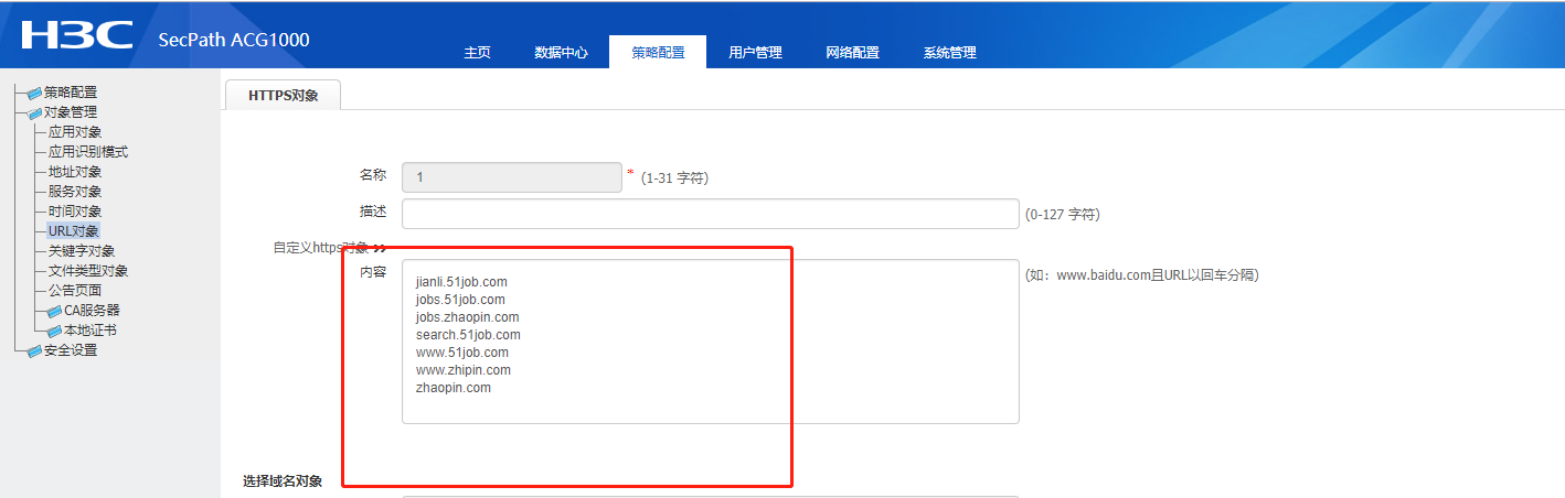 有用户要审员工的网页访问记录,尤其要看到招聘网站的信息,现在ACG自有分类里面网站没有,配了SSL解密策略,调用了HTTPS解密对象,还是有些域名审计不出来,自己加域名也不支持*.***.***的形式,不能全匹配。