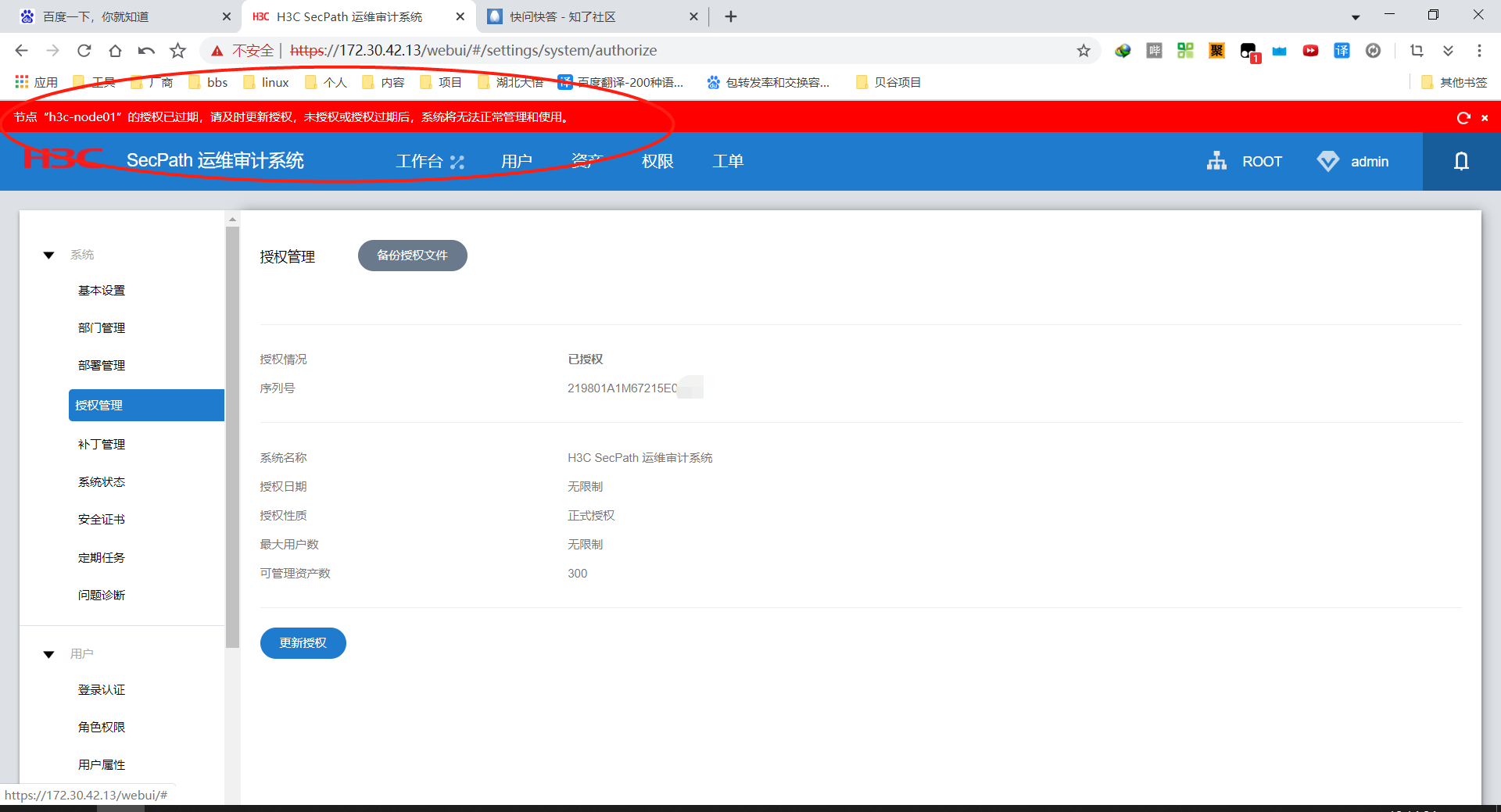 节点“h3c-node01”的授权已过期,请及时更新授权,未授权或授权过期后,系统将无法正常管理和使用。