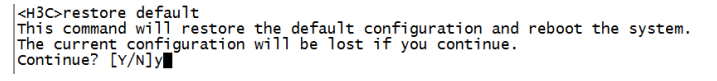 <H3C>提示进入设备命令行,命令行下输入:restore default命令并回车,再次输入Y确认后,路由器将恢复到出厂设置并重新启动,同时账号密码也恢复到初始配置,初始账号密码均为小写的admin。