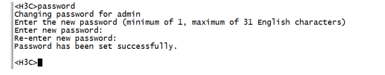 <H3C>提示进入设备命令行,输入password命令并回车,按照系统提示,提示:enter new password(输入新密码),则可以直接输入新密码,并重新输入一次确认即可。