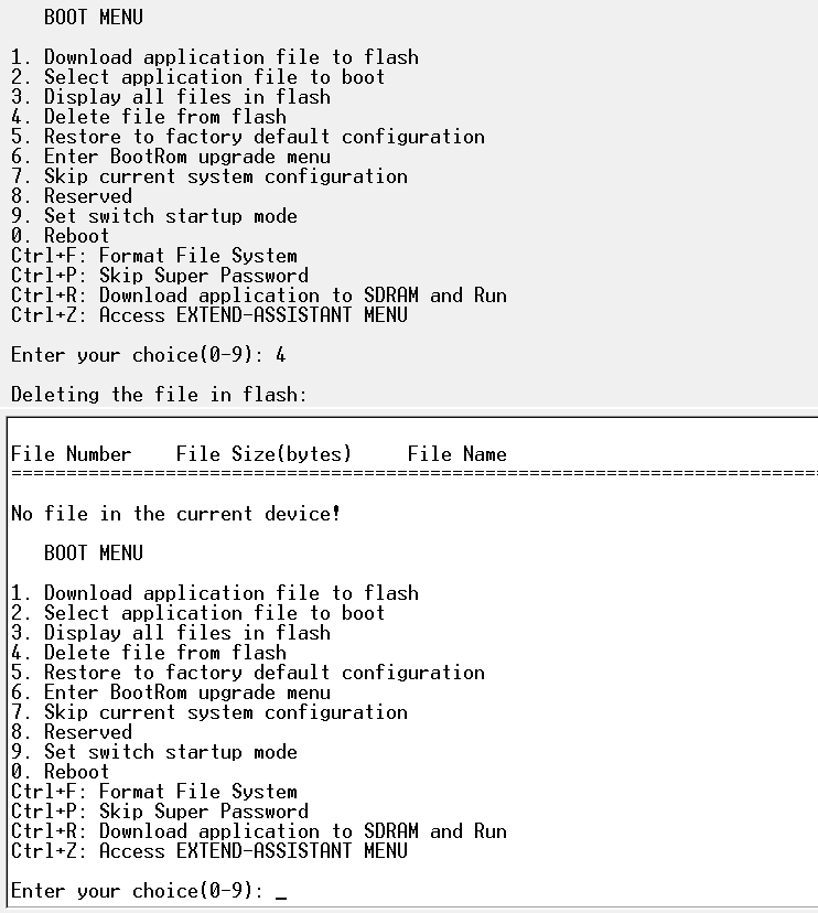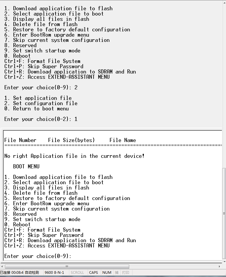 3)必须在出现“Press Ctrl-B to enter Boot Menu...”的2秒钟之内,键入<Ctrl+B>,才能进入BOOT菜单,否则系统将进入程序解压过程;若程序进入解压过程后再希望进入BOOT菜单,则需要重新启动交换机。