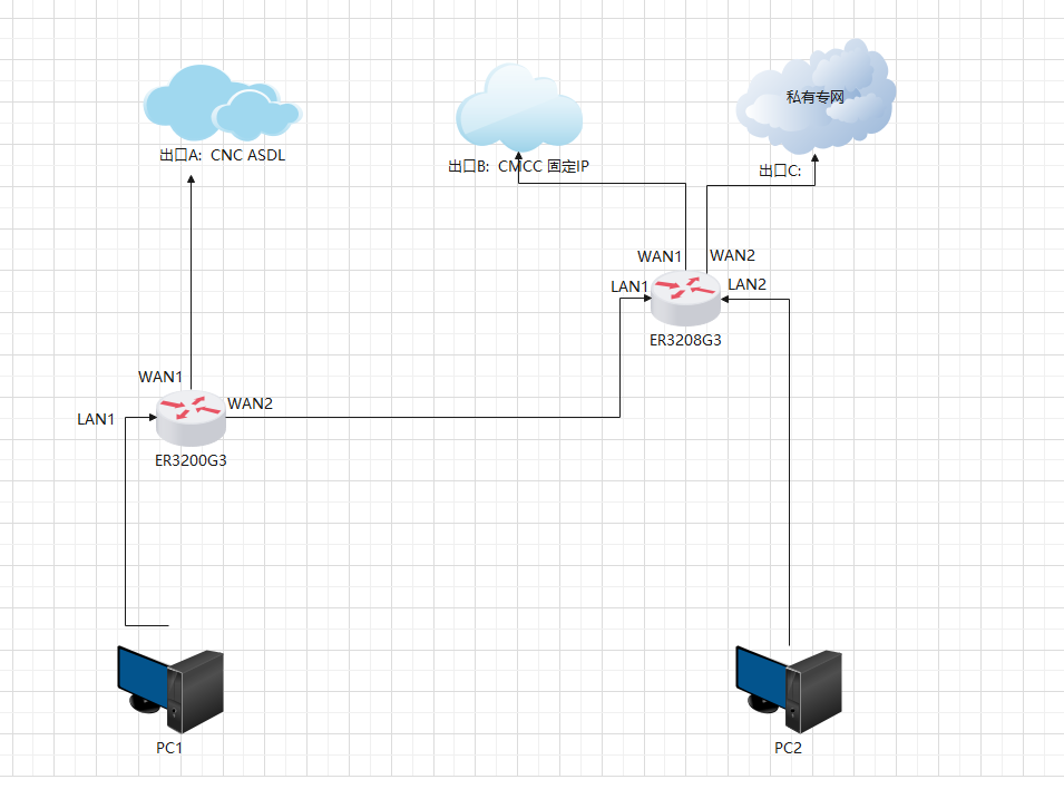 有两台宽带路由器ER3200G3、ER3208G3,三个出口,网通出口A:CNC ADSL,移动专网B:CMCC固定IP;私有专网C:固定IP。