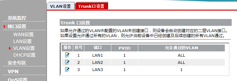 页面向导:接口设置→VLAN 设置→Trunk口设置