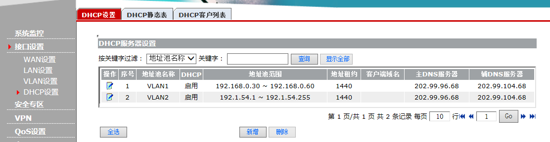 接口设置→DHCP设置→DHCP设置