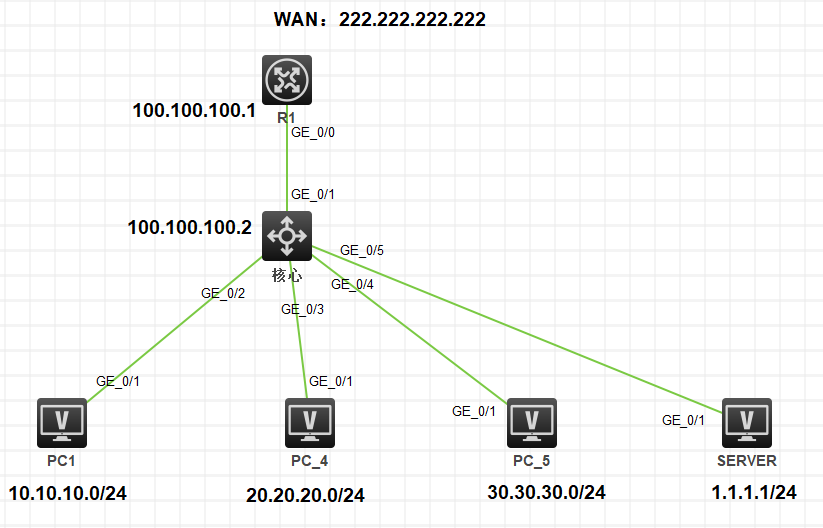 如果在R1的G0/0口配置nat hairpin enable,核心下所有的终端都可以通过WAN口地址访问服务器