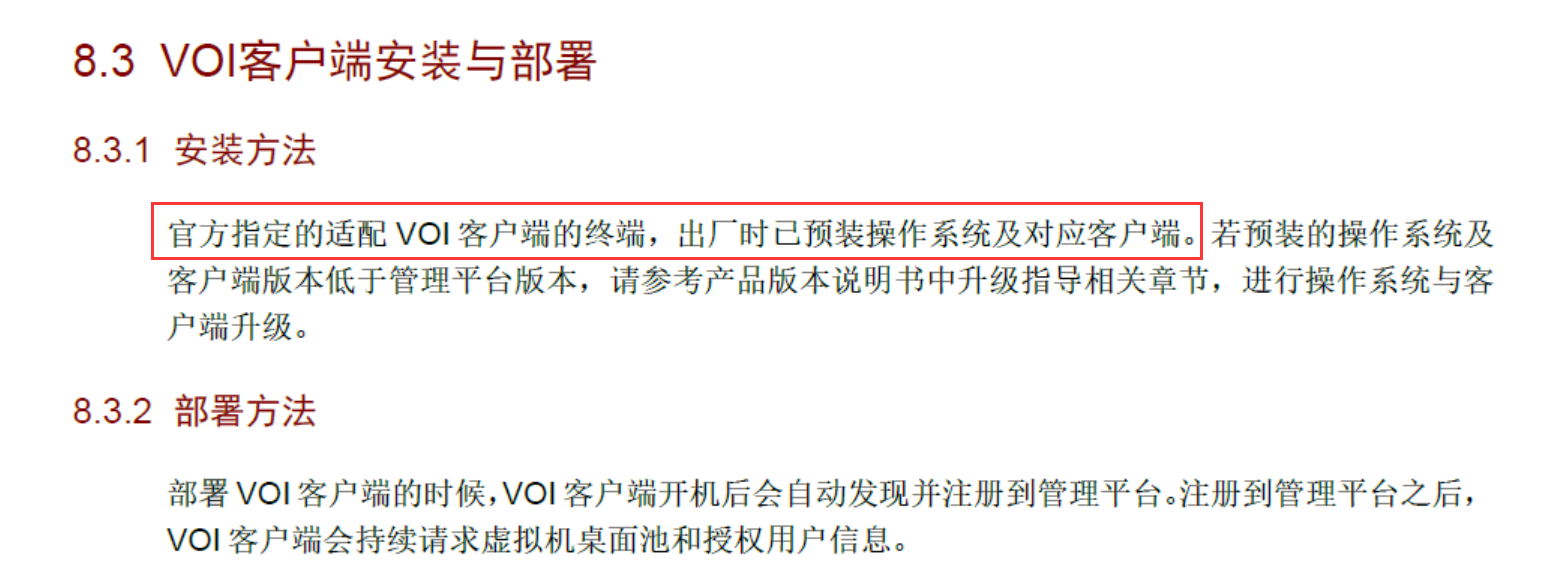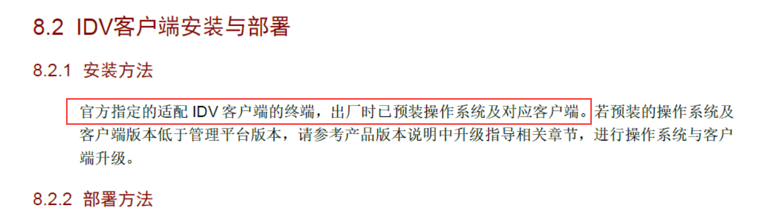 我看《H3C Workspace云桌面 安装指导-E1009-5W114-整本手册.pdf》上只介绍了VDI的客户端在PC机上的安装步骤。 IDV和VOI只是说了“官方指定的适配IDV(VOI) 客户端的终端,出厂时已预装操作系统及对应客户端。”