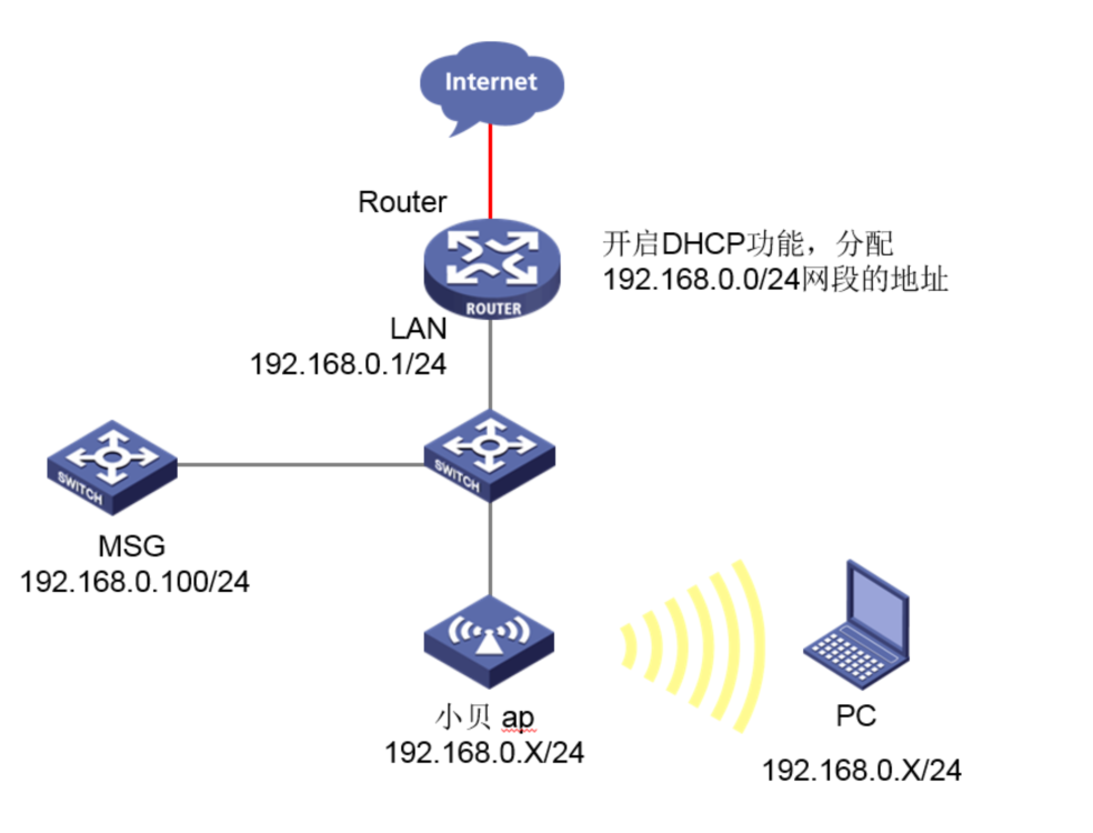 #提示:如组网图所示,内网已经有台路由器充当DHCP服务器功能,路由器IP地址是:192.168.0.1/22,DHCP范围是:192.168.0.0/22,和MSG360的IP一个网段,用于AP和无线客户端下发IP地址。