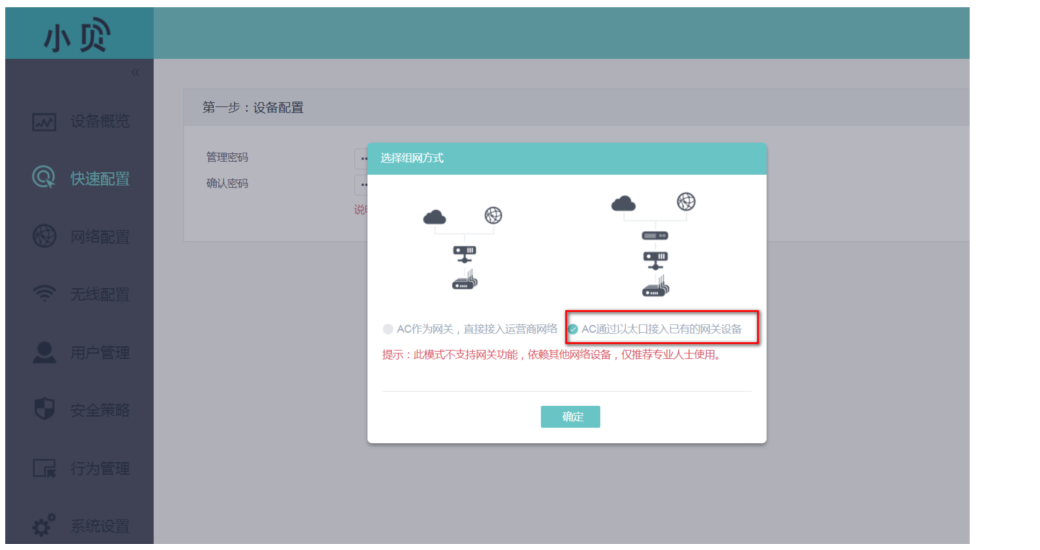 #在“快速配置”中选择“AC通过以太网口接入已有的网关设备”。