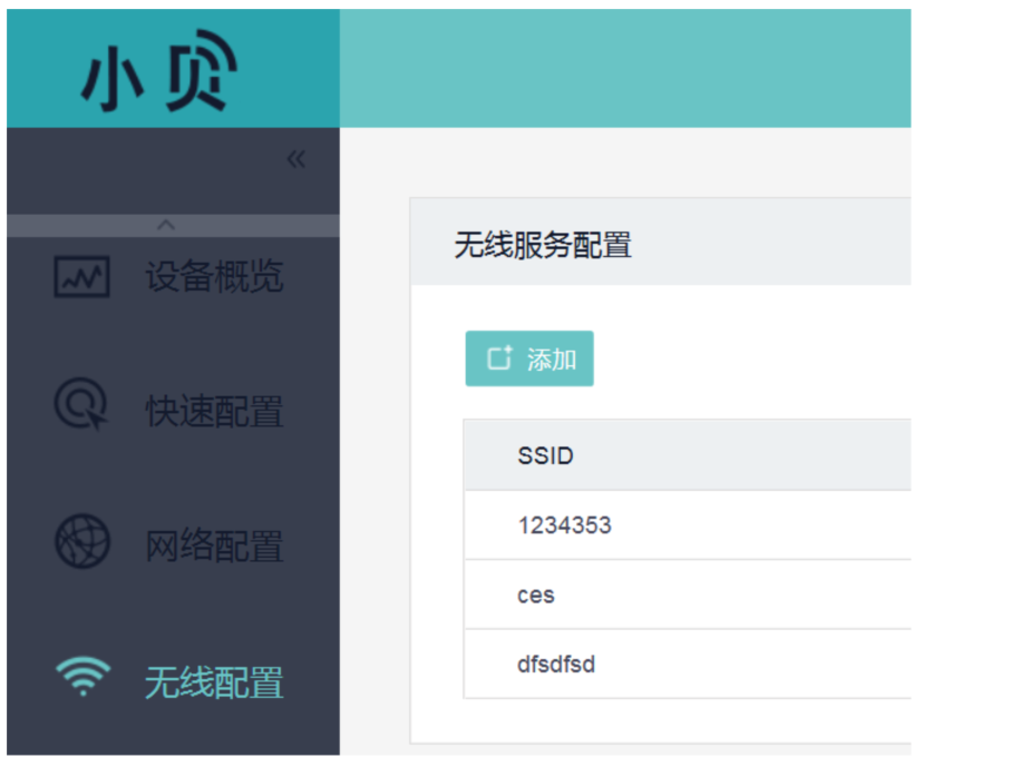 #选择“无线配置”>“无线服务配置”>“添加”中新增无线服务。设置无线SSID名称为“test”。并开启服务模板。