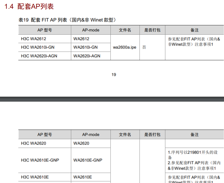 第二张图是配套AP列表,指的是这款AC能支持哪些型号的AP上线,是AP mode,是按照AP型号来区分的。表格的第三列文件名,指的是AP版本是属于哪个AP系列的,一个AP系列使用一个AP ipe文件。表格的第四列是否打包指的是AP的版本文件是否打包在AC的ipe文件中,如果是,则升级AC即可将这些AP的版本自动解压至AC的flash中,不用人工干预;如果否就表示这些AP的版本文件是附带在AC的版本压缩包里的,需要手动解压压缩包,将AP的ipe文件上传到AC上,这时AP在注册时才会成功更新版本。