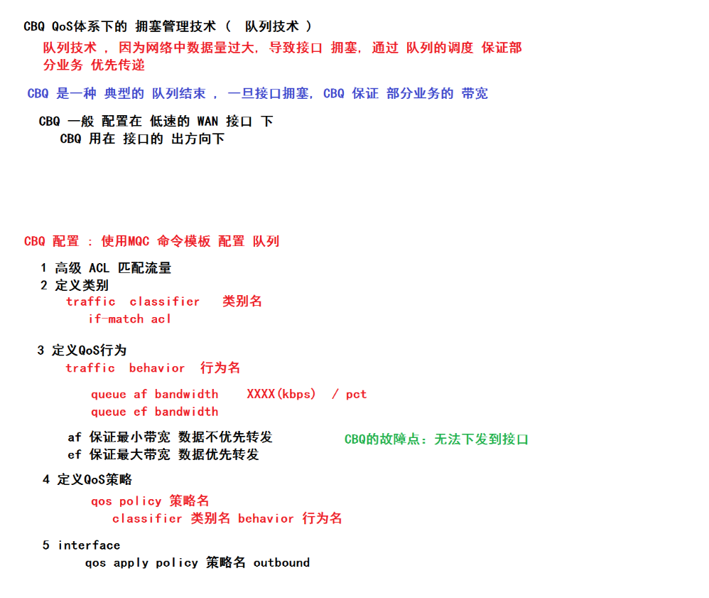 CBQ是对WFQ功能的扩展,为用户提供了定义类的支持。在网络拥塞时,CBQ根据用户定义的类规则对报文进行匹配,并使其进入相应的队列,在入队列之前必须进行拥塞避免机制和带宽限制的检查。在报文出队列时,加权公平调度每个类对应的队列中的报文。拥塞管理场景。