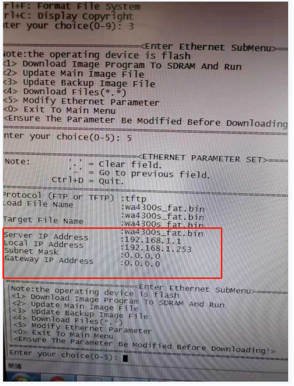你这个是瘦AP吧,进入命令行设置不是这样设置的,这个地方设置的地址是TFTP协议用来上传版本用的,可以进行设置和修改,修改的话是直接在后边重新输入一个地址