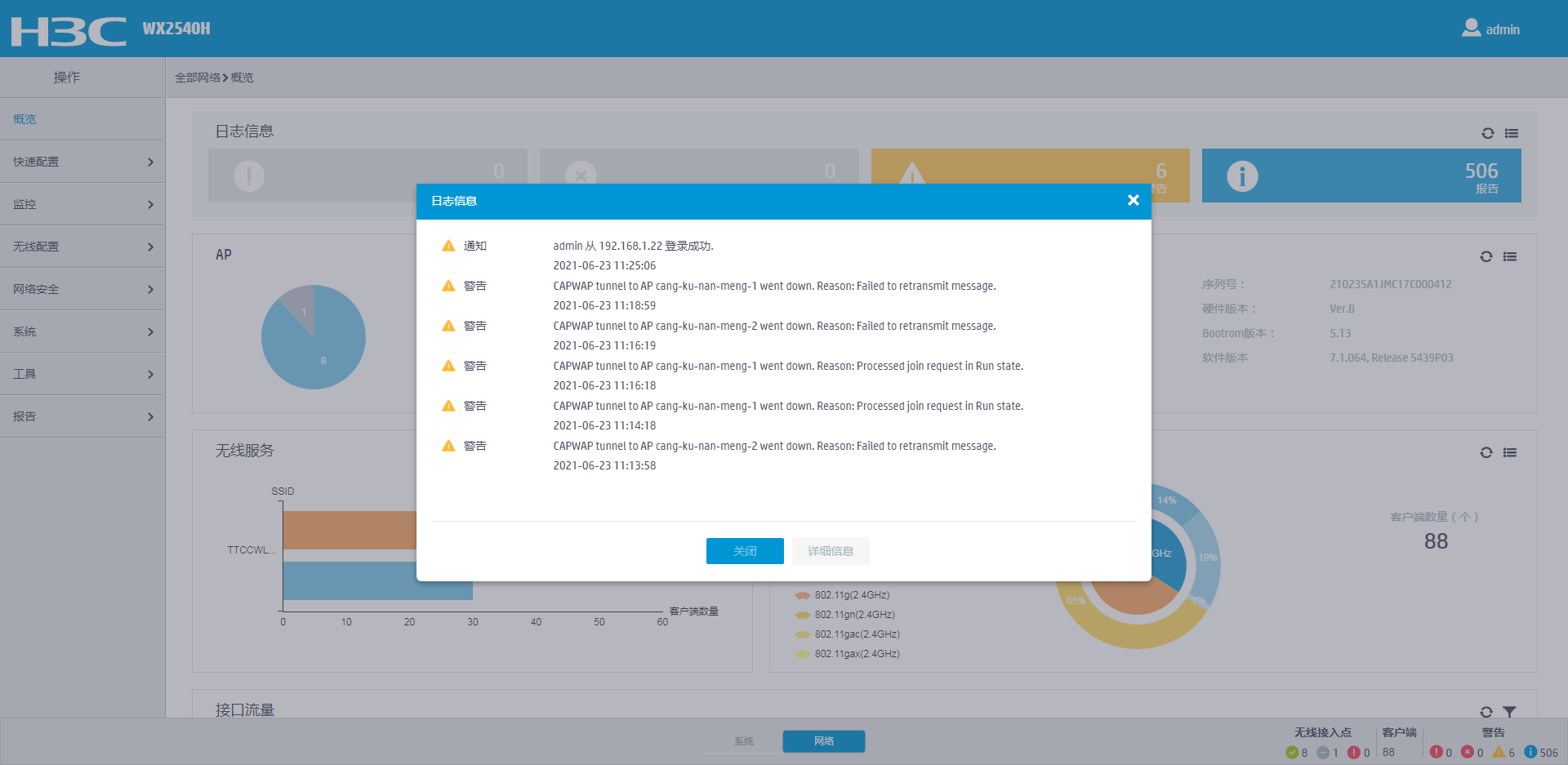 AP和AC的隧道断开了 AC上判断的原因是多次探测AP不成功 然后判断AP离线。