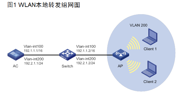 如图1所示,Switch作为DHCP服务器为AP和Client分配IP地址,其中AP与AC使用VLAN 100建立CAPWAP隧道,Client使用VLAN 200接入无线网络。现要求:在AC上配置本地转发功能,使Client的数据流量不经过AC,直接由AP转发。