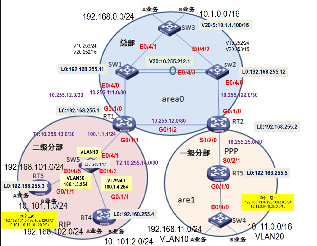 选路需求:业务A到二级分部业务A:SW3-SW1-RT1-RT3 业务A到一级分部业务A:SW3-SW1-RT1-RT2-RT5 业务B到二级分部业务B:SW3-SW2-RT2-RT1-RT3 业务B到一级分部业务B:SW3-SW2-RT2-RT5