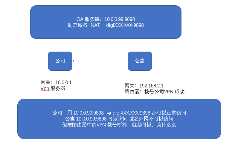 如果公寓用 路由器里面VPN 客户端拨公司,就不能用域名+端口访问OA网站。但用内网可以。如果把路由器里拨号断开,则外网地址可以访问OA