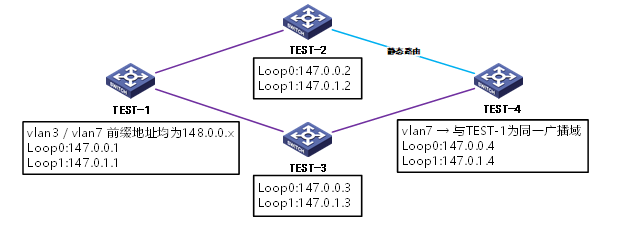 l TEST-4:①配置vlan7,此交换机下联有60台接入设备,接口地址以148.0.0开头,并要求与TEST-1的vlan7处于同一广播域。②通过静态路由与TEST-2互联。③通过OSPF与TEST-3互联,区域为2。④配置2个环回地址用于测试。