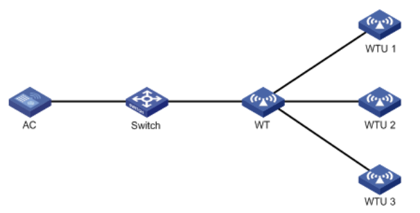 如图3-1所示,使用无线终结者方案构建一个无线网络。其中,WT和AC通过Switch相连,WTU 1、WTU 2、WTU 3分别连接到WT的WTU接口1、2、3上。AC作为DHCP服务器为WT和无线客户端分配IP地址。