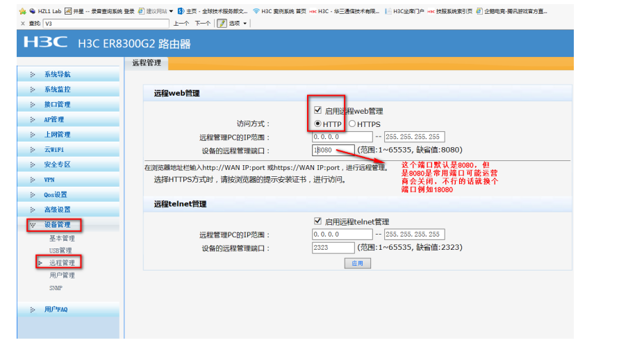 #登陆WEB界面(默认情况下,登录地址为192.168.1.1,登陆账号为admin,登陆密码为admin),在导航栏中选择“设备管理 >远程管理>远程管理”。 开启远程Web管理,访问方式可以选择“http”或者“https”