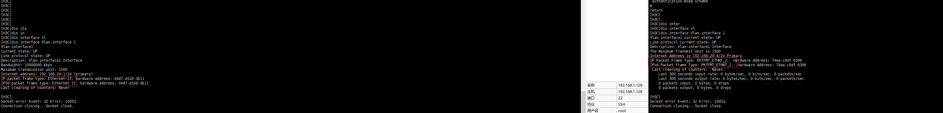 [H3C]dis interface Vlan-interface 1 Vlan-interface1 Current state: UP Line protocol state: UP Description: Vlan-interface1 Interface Bandwidth: 10000000 kbps Maximum transmission unit: 1500 Internet address: 192.168.20.1/24 (primary) IP packet frame type: Ethernet II, hardware address: 04d7-a52d-3b11 IPv6 packet frame type: Ethernet II, hardware address: 04d7-a52d-3b11 Last clearing of counters: Never