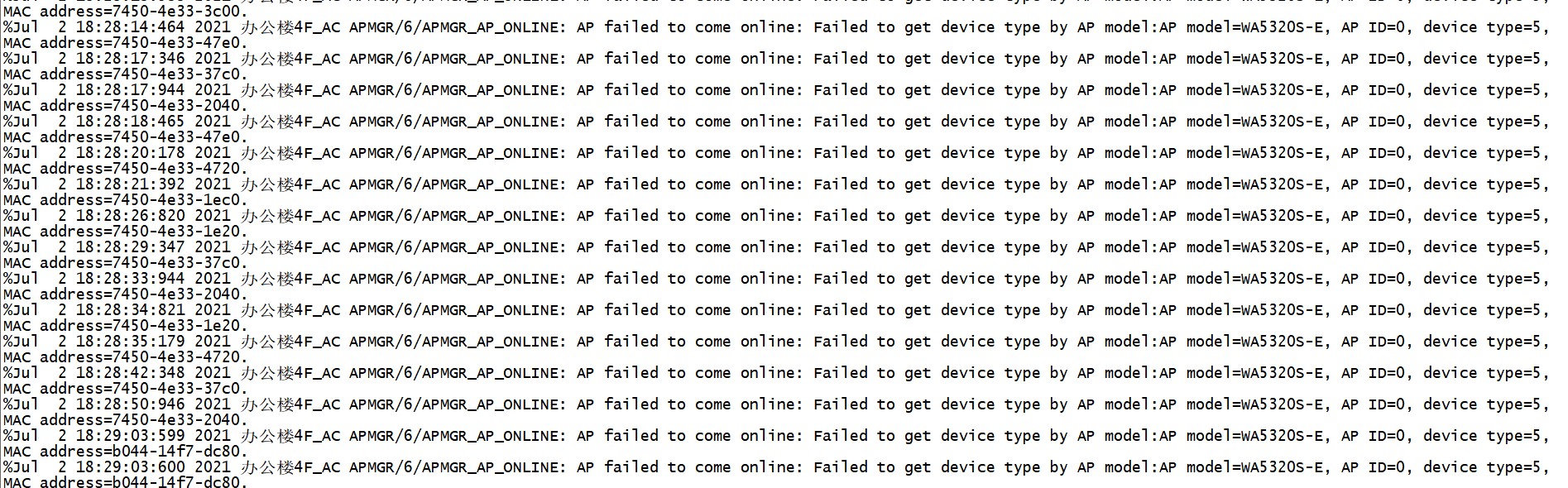 开局无线组网,AC与AP二层组网,DHCP另外部署,网关是DHCP服务器。AC:192.168.1.253、网关192.168.1.254,没有指option43。开局AC就提示如图信息,AP能获取地址也能远程登录,就是一直无法注册。