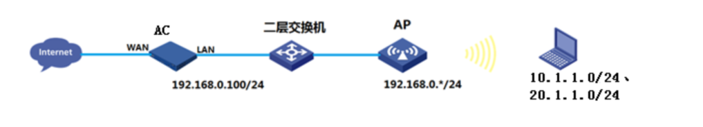 1、AC和AP通过二层交换机相连,AC的1口和交换机1口互连,AP接在交换机的2口。Vlan1为AP管理vlan,网段为192.168.0.0/24,使用二层自动注册。AC作为DHCP服务器。