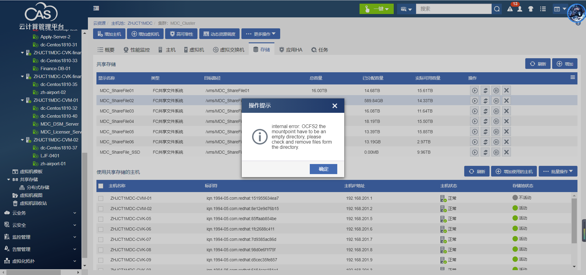 将一些虚拟机迁移到MDC-ShairFile02是提示迁移失败的,也看到CVM-02没有挂载MDC-ShairFile02,点击启动存储池提示这样 ,有error