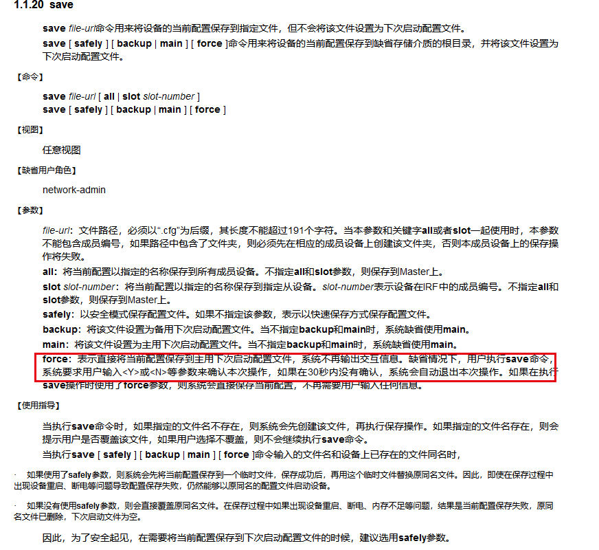 force:表示直接将当前配置保存到下次启动配置文件,系统不再输出交互信息。缺省情况下,用户执行save命令,系统要求用户输入<Y>或<N>等参数来确认本次操作,如果在30秒内没有确认,系统会自动退出本次操作。如果在执行save操作时使用了force参数,则系统会直接保存当前配置,不再需要用户输入任何信息。