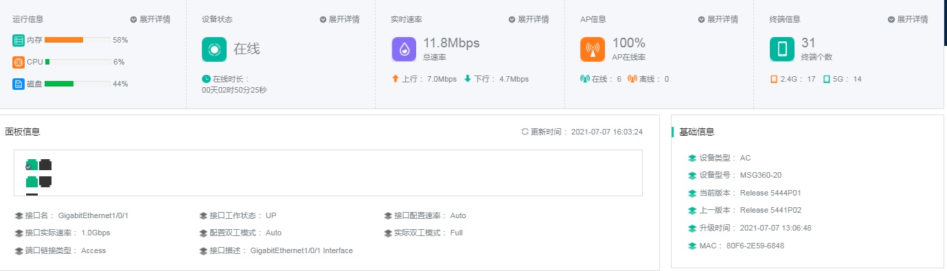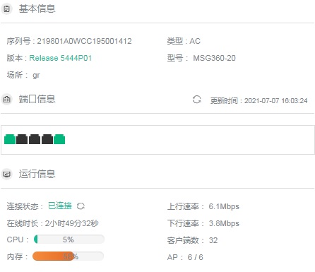 AP name : ap1 AP ID : 1 AP group name : default-group State : Run Backup type : Master Online time : 0 days 3 hours 9 minutes 20 seconds System uptime : 0 days 3 hours 12 minutes 21 seconds Model : WAP712C-LI Region code : CN Region code lock : Disabled Serial ID : 219801A1Y7819BP005J5 MAC address : 4077-a9be-0f70 IP address : 10.10.10.9 UDP control port number : 2563 UDP data port number : 2563 H/W version : Ver.A S/W version : R2444P01 Boot version : 7.21 USB state : N/A Power level : N/A Power info : N/A Description : Not configured Priority : 4 Echo interval : 10 seconds Echo count : 3 counts Keepalive interval : 10 seconds Discovery-response wait-time : 2 seconds Statistics report interval : 50 seconds Fragment size (data) : 1500 Fragment size (control) : 1450 MAC type : Local MAC & Split MAC Tunnel mode : Local Bridging & 802.3 Frame & Native Frame CAPWAP data-tunnel status : Up Discovery type : Unknown Retransmission count : 3 Retransmission interval : 5 seconds Firmware upgrade : Enabled Sent control packets : 6375 Received control packets : 6375 Echo requests : 1133 Lost echo responses : 0 Average echo delay : 0 Last reboot reason : Auto update soft reboot Latest IP address : 10.10.10.9 Current AC IP : 10.10.10.1 Tunnel down reason : N/A Connection count : 1 Backup IPv4 : Not configured Backup IPv6 : Not configured Ctrl-tunnel encryption : Disabled Ctrl-tunnel encryption state : Not encrypted Data-tunnel encryption : Disabled Data-tunnel encryption state : Not encrypted LED mode : Normal Remote configuration : Disabled EnergySaving Level : 0 AP type : Normal AP Radio 1: BSSID : 4077-a9be-0f70 State : Up Type : 802.11ac Antenna type : internal Client dot11ac-only : Disabled Client dot11n-only : Disabled Channel bandwidth : 20/40MHz Operating bandwidth : 20/40MHz Secondary channel mode : SCA Short GI for 20MHz : Supported Short GI for 40MHz : Supported Short GI for 80MHz : Supported Short GI for 160MHz : Not supported MIMO : Not Config Green-Energy-Management : Disabled A-MSDU : Enabled A-MPDU : Enabled LDPC : Supported STBC : Supported Operational VHT-MCS set: Mandatory : Not configured Supported : NSS1 0,1,2,3,4,5,6,7,8,9 Multicast : Not configured Operational HT MCS set: Mandatory : Not configured Supported : 0, 1, 2, 3, 4, 5, 6, 7 Multicast : Not configured Channel : 52 Channel usage(%) : 0 Max power : 20 dBm Operational rate: Mandatory : 6, 12, 24 Mbps Multicast : Auto Supported : 9, 18, 36, 48, 54 Mbps Disabled : Not configured Distance : 1 km ANI : Enabled Fragmentation threshold : 2346 bytes Beacon interval : 100 TU Protection threshold : 2346 bytes Long retry threshold : 4 Short retry threshold : 7 Frame aging time in cache : 2000 ms Noise floor : -96 dBm Protection mode : cts-to-self Continuous mode : N/A ATF : Disabled HT protection mode : No protection Radio 2: BSSID : 4077-a9be-0f78 State : Up Type : 802.11n(2.4GHz) Antenna type : internal Client dot11n-only : Disabled Channel bandwidth : 20MHz Operating bandwidth : 20MHz Secondary channel mode : SCN Short GI for 20MHz : Supported Short GI for 40MHz : Supported MIMO : Not Config Green-Energy-Management : Disabled A-MSDU : Enabled A-MPDU : Enabled LDPC : Supported STBC : Supported Operational HT MCS set: Mandatory : Not configured Supported : 0, 1, 2, 3, 4, 5, 6, 7, 8, 9, 10, 11, 12, 13, 14, 15 Multicast : Not configured Channel : 7 Channel usage(%) : 28 Max power : 20 dBm Preamble type : Short Operational rate: Mandatory : 11 Mbps Multicast : Auto Supported : 12, 18, 24, 36, 48, 54 Mbps Disabled : 1, 2, 5.5, 6, 9 Mbps Distance : 1 km ANI : Enabled Fragmentation threshold : 2346 bytes Beacon interval : 100 TU Protection threshold : 2346 bytes Long retry threshold : 4 Short retry threshold : 7 Frame aging time in cache : 2000 ms Noise floor : -105 dBm Protection mode : cts-to-self Continuous mode : N/A ATF : Disabled HT protection mode : No protection