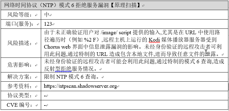 如题,我们的防火墙M9006(R9141P42)被漏扫出有NTP模式6拒绝服务漏洞,具体如下截图: