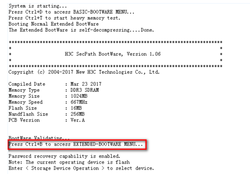 2、如果所有密码都忘记了,可通过重启,按下“ctrl+b”进入bootrom,选择跳过console密码选项进入设备后修改。
