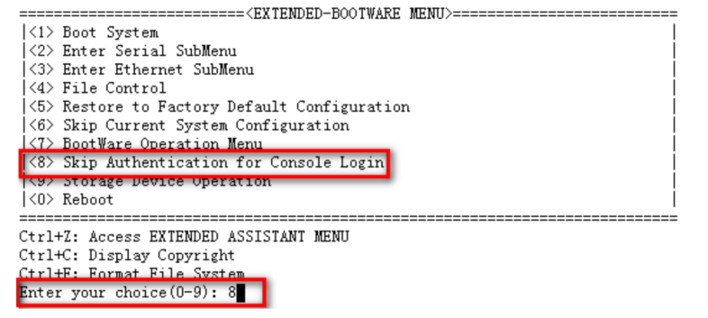 #设备启动过程中根据提示按 crtl+B进入 bootware界面,选择 <8>跳过 Console 密码认证