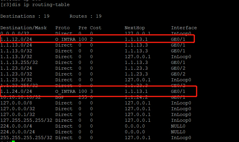 路由表只显示最优路由,所以无法显示调大了COST后的路由。