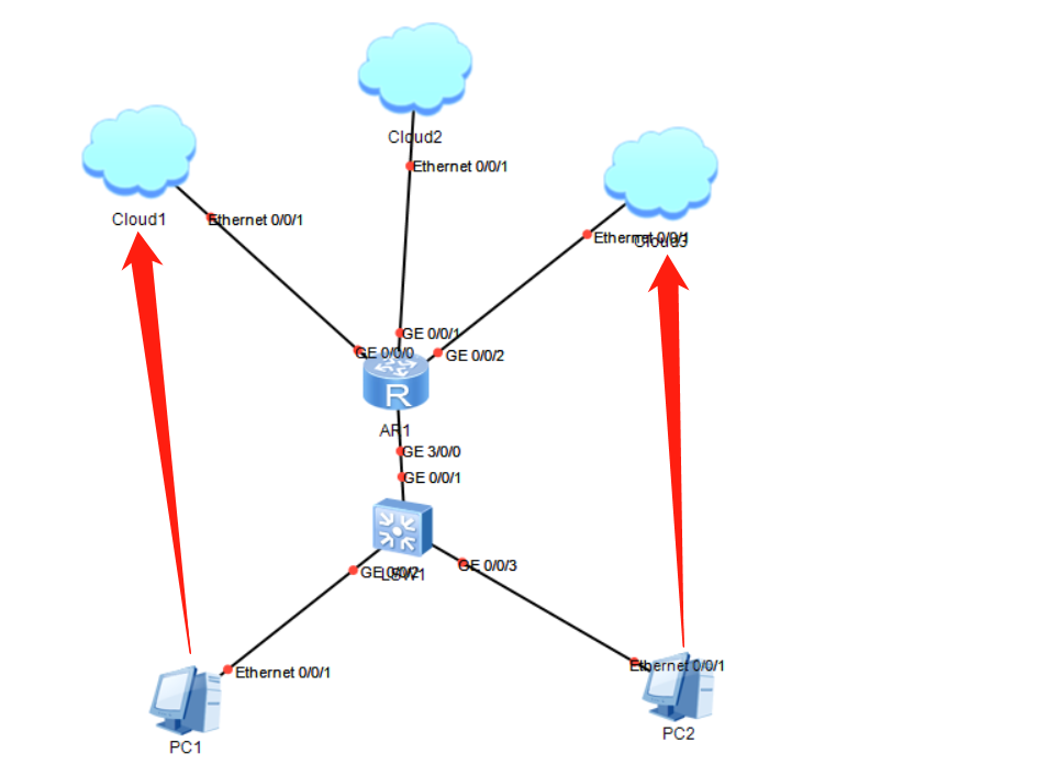 1.PC1走出口1,PC2走出口2,可以通过策略路由实现?
