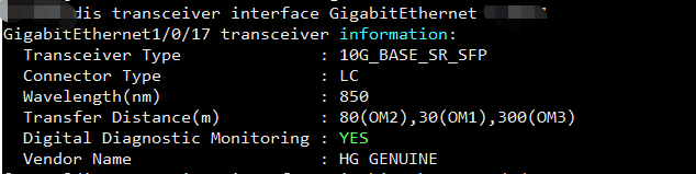 [H3C]dis transceiver interface GigabitEthernet 1/0/1 //查看光模块的信息