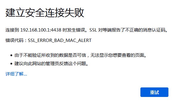 配好之后,用浏览器登录设备https://ip地址,默认443端口,提示以下报错。尝试改浏览器Internet选项的安全ssl2.0/ssl3.0/tls1.2等,没用。