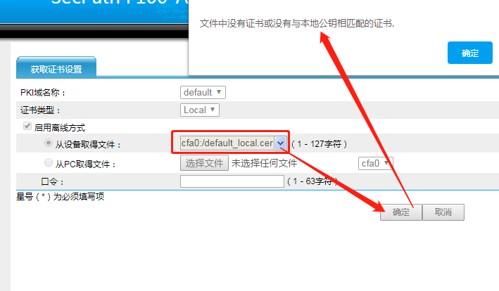 选用设备默认自签名的本地证书加载到内存时报错:文件中没有证书或没有与本地公钥相匹配的证书。