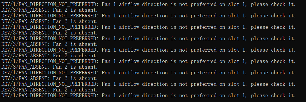 %Jan 1 00:04:31:705 2011 H3C DEV/1/FAN_DIRECTION_NOT_PREFERRED: Fan 2 airflow direction is not preferred on slot 1, please check it.