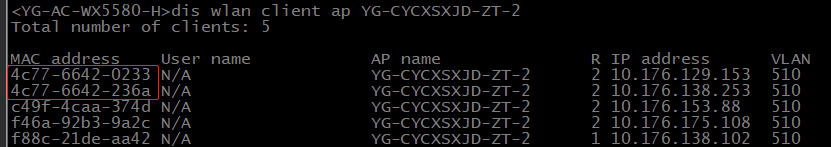 用户(红框内是用户的MAC地址)无法连接AP释放的5G信号。但是网卡支持802.11n